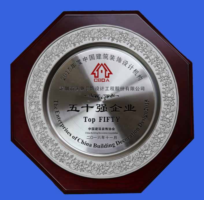 2017年3月23日中國建筑裝飾協(xié)會在上海舉行的2017年中國建筑裝飾設(shè)計藝術(shù)發(fā)展論壇中,深圳市文業(yè)裝飾設(shè)計工程股份有限公司榮獲2015年度中國建筑裝飾設(shè)計機構(gòu)“五十強企業(yè)”,2015年度中國建筑裝飾優(yōu)秀專業(yè)化設(shè)計機構(gòu)“文化、體育空間設(shè)計”、“辦公空間設(shè)計”和“別墅、商品房、公寓空間設(shè)計”獎項。設(shè)計研究院院長方斌先生喜得“2016中國設(shè)計年度人物入圍獎”和“CBDA跨界藝術(shù)家獎”。