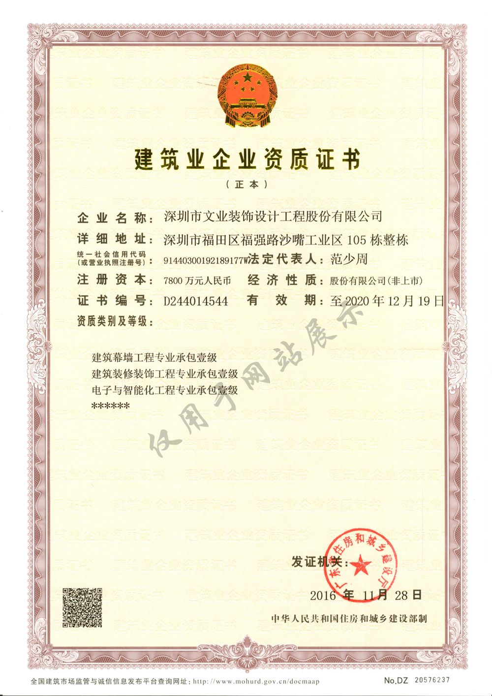 在辭舊迎新的歡樂氣氛中,公司資質升級又添喜訊。深圳市文業(yè)裝飾設計工程股份有限公司在努力鑄建精品工程的同時,不斷完善和提升企業(yè)資質工作,經(jīng)廣東省住房和城鄉(xiāng)建設廳核準,成功獲得了“電子與智能化工程專業(yè)承包一級”資質。截止目前我公司擁有建筑裝修裝飾工程專業(yè)承包一級、設計甲級資質;建筑幕墻工程專業(yè)承包一級、設計甲級資質;電子與智能化工程專業(yè)承包一級資質及消防設施工程專業(yè)承包、鋼結構工程承包、建筑機電安裝工程專業(yè)承包等資質。