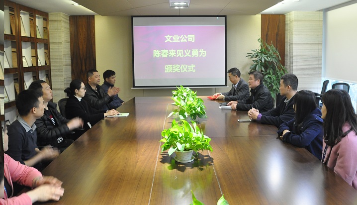 為表彰見(jiàn)義勇為行為,弘揚(yáng)社會(huì)正氣,公司于本月十日在會(huì)議室召開(kāi)隆重表彰獎(jiǎng)勵(lì)大會(huì),總裁范少周宣讀了《關(guān)于表彰陳春來(lái)見(jiàn)義勇為的決定》,并為其頒發(fā)了榮譽(yù)證書(shū)和獎(jiǎng)金。范總裁希望陳春來(lái)同志再接再厲,在見(jiàn)義勇為工作中再創(chuàng)佳績(jī)。同時(shí)要求全體員工要以陳春來(lái)為榜樣,以樹(shù)立良好社會(huì)風(fēng)氣為己任,自覺(jué)維護(hù)國(guó)家和集體利益,保護(hù)人民群眾生命財(cái)產(chǎn)安全,為構(gòu)建和諧社會(huì)作出新的更大的貢獻(xiàn)!