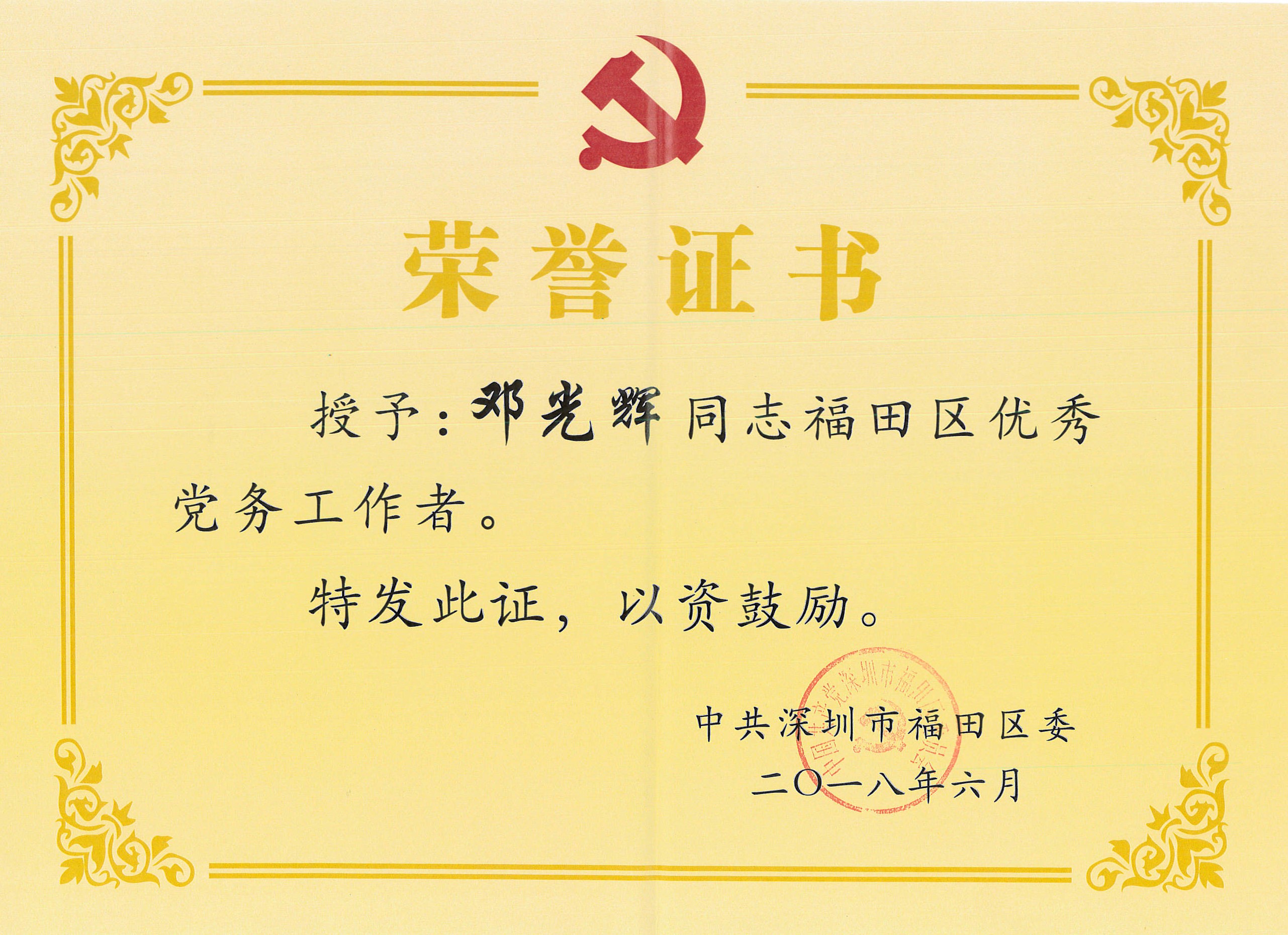 2018年6月29日,“福田區(qū)慶祝建黨97周年表彰大會”在區(qū)委會堂隆重舉行,會上文業(yè)裝飾黨支部書記、副總裁鄧光輝同志被中共深圳市福田區(qū)委授予“福田區(qū)優(yōu)秀黨務(wù)工作者”稱號。